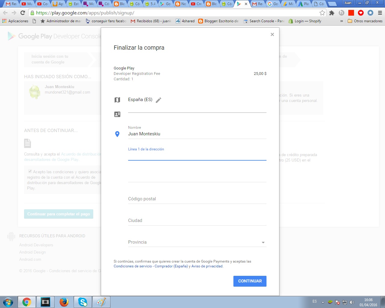 Ahora tienes que hacer el pago de unos $25 que requiere Google Play. Solo realiza este pago una vez.